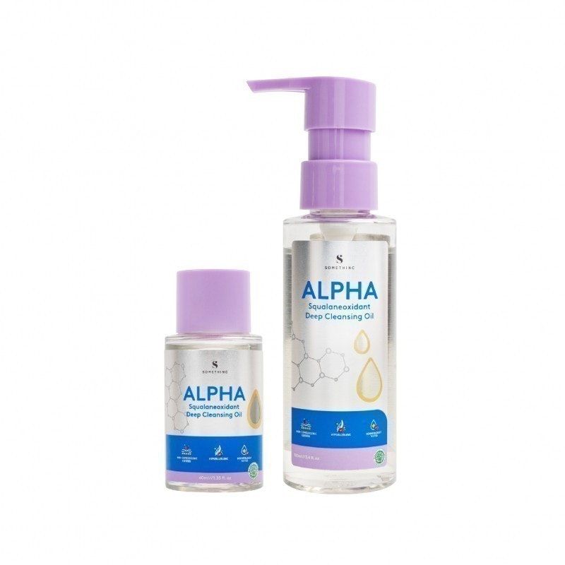 SOMETHINC Alpha Squalaneoxidant Deep Cleansing Oil membersihkan wajah dengan teknologi Micelle, ideal untuk kulit sensitif. Mengandung squalane, olive oil, dan sunflower oil untuk kelembapan, serta bebas bahan hewani.