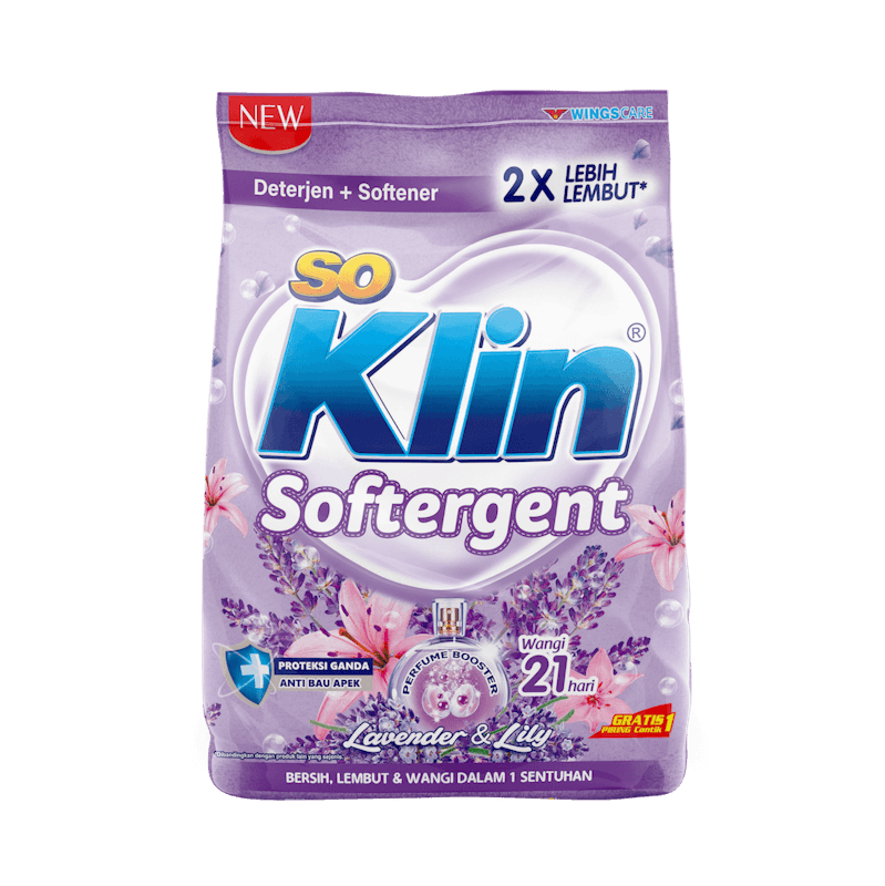 Soklin Deterjen Bubuk Softergent Lavender & Lily memberikan kelembutan dan keharuman tahan lama pada pakaian dengan formula inovatif dan teknologi Perfume Booster.