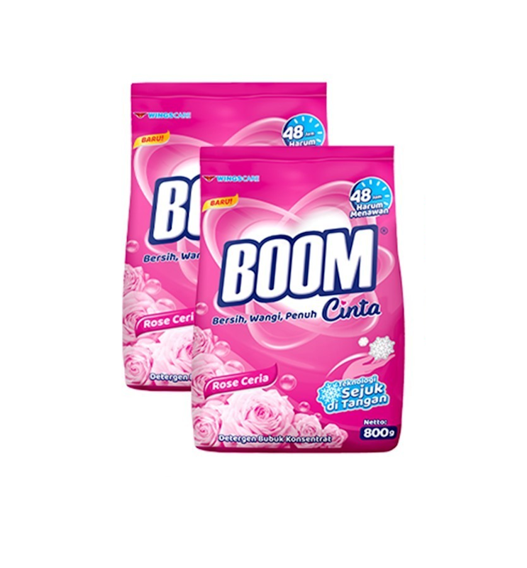 Boom® Cinta Deterjen Bubuk Rose Ceria efektif menghilangkan noda sulit dengan harga ekonomis, menjaga warna pakaian tetap cemerlang hingga 20x pencucian, dan memberikan aroma mawar yang tahan hingga 48 jam.