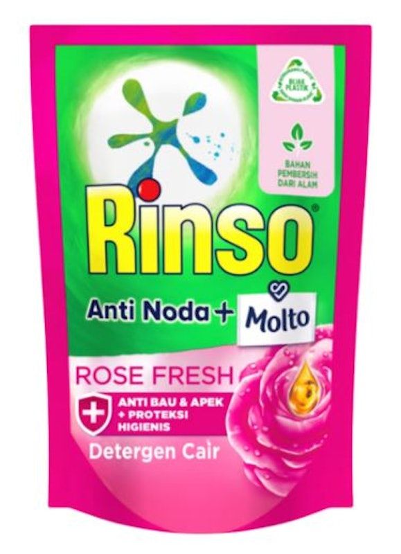 Rinso Molto Deterjen Cair Anti Noda Rose Fresh dengan teknologi SmartFoam menghilangkan noda cepat, busa cepat hilang, dan memberikan aroma bunga mawar dan strawberry yang segar.