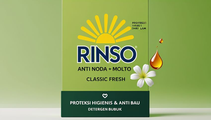 Rinso terkenal dengan formula yang efektif menghilangkan noda, menjaga warna pakaian, dan memiliki wangi segar yang tahan lama.