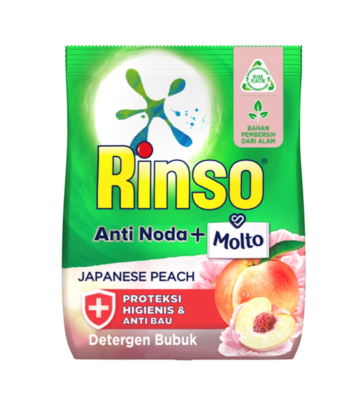 Rinso Molto Detergen Bubuk Japanese Peach dengan aroma buah persik Jepang dan bunga sakura yang menyegarkan, membersihkan pakaian dari noda, serta ramah lingkungan.