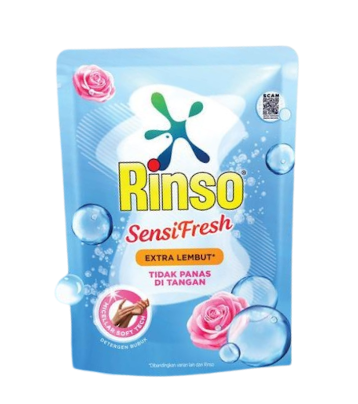 Rinso Sensi Fresh Detergen Cair dengan teknologi Micellar Soft, memberikan kelembutan pada tangan dan aroma bunga mawar serta apel segar yang tahan hingga 48 jam, aman untuk kulit sensitif.