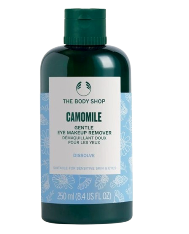 The Body Shop Camomile Gentle Eye Makeup Remover menghapus makeup mata dengan lembut, aman untuk kulit sensitif dan pengguna lensa kontak, memberikan sensasi segar tanpa iritasi.