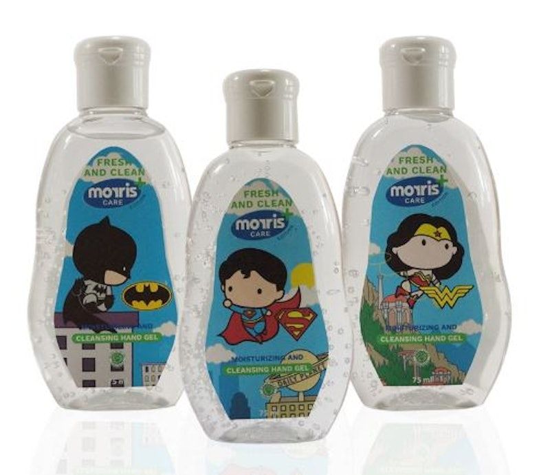 Hand sanitizer gel dengan desain karakter superheroes, melindungi anak dari kuman dengan 70% alkohol dan pelembap, aman untuk kulit sensitif.