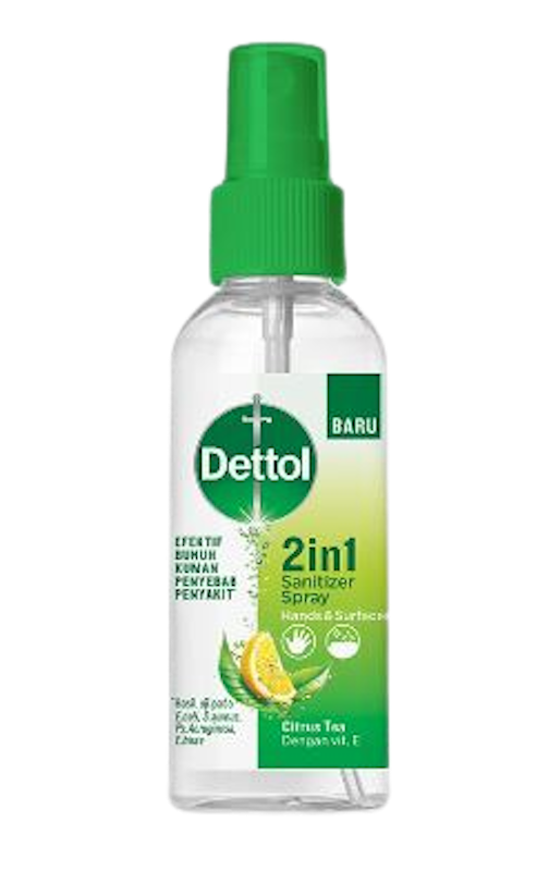 Dettol Hand Sanitizer & Surface Spray 2in1 membunuh 99,9% kuman dan bakteri pada tangan serta permukaan, memberikan perlindungan maksimal dengan aroma citrus tea.
