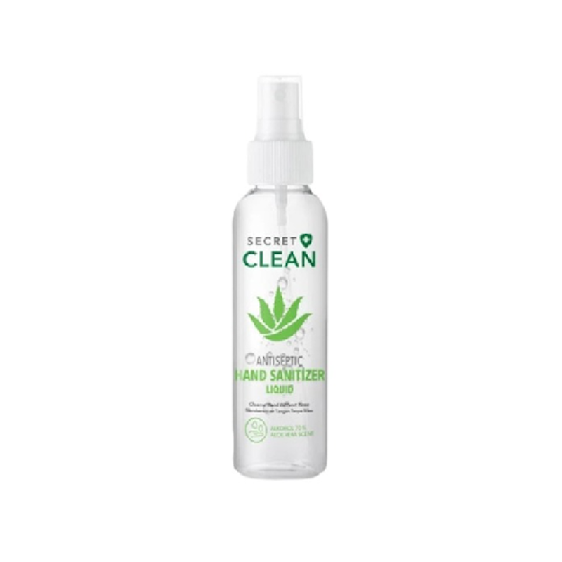 Hand sanitizer spray Secret Clean dengan keharuman Aloe vera, cepat kering, dan aman untuk kulit sensitif. Formulanya mengandung 70% alkohol etanol yang efektif membunuh kuman tanpa menimbulkan iritasi.