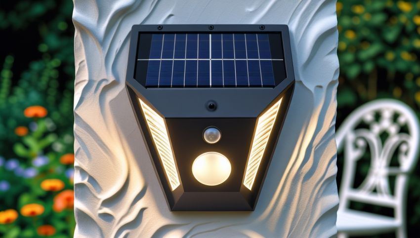Lampu dinding outdoor dengan panel surya dan motion sensor, hemat energi dan tahan air IP65.