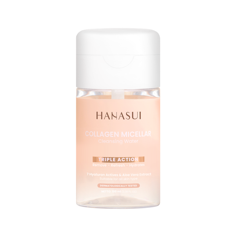 Hanasui Collagen Micellar Cleansing Water membersihkan dan menghidrasi kulit wajah dengan formula triple action, mengandung collagen water dan ekstrak Aloe vera yang menenangkan dan melembapkan.