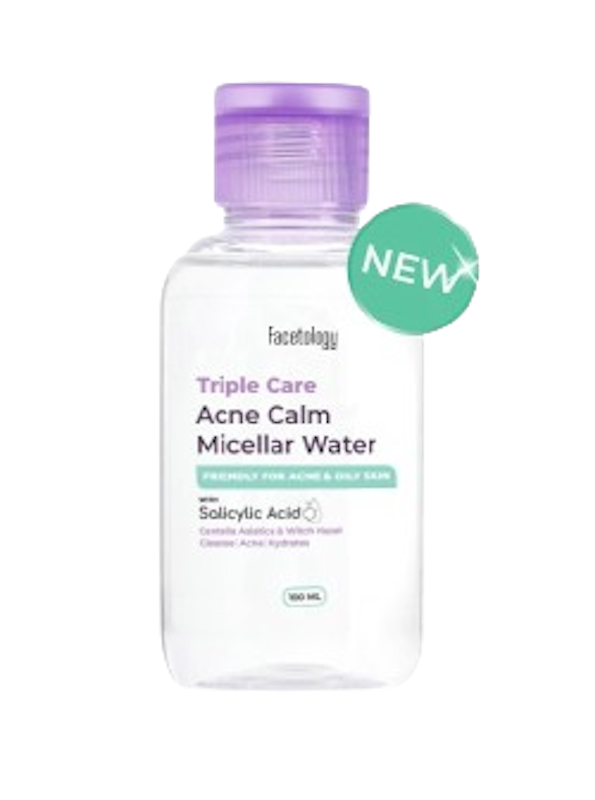 Facetology Triple Care Acne Calm Micellar Water mengandung witch hazel dan tea tree oil yang efektif mengontrol minyak berlebih, melawan bakteri penyebab jerawat, serta menenangkan kulit.