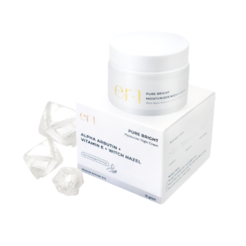 Er-1 Pure Bright Moisturizer Night Cream mengurangi flek hitam dan bekas jerawat dengan alpha arbutin, vitamin E, dan witch hazel. Menjaga kelembapan kulit agar tampak kenyal dan glowing setiap pagi.