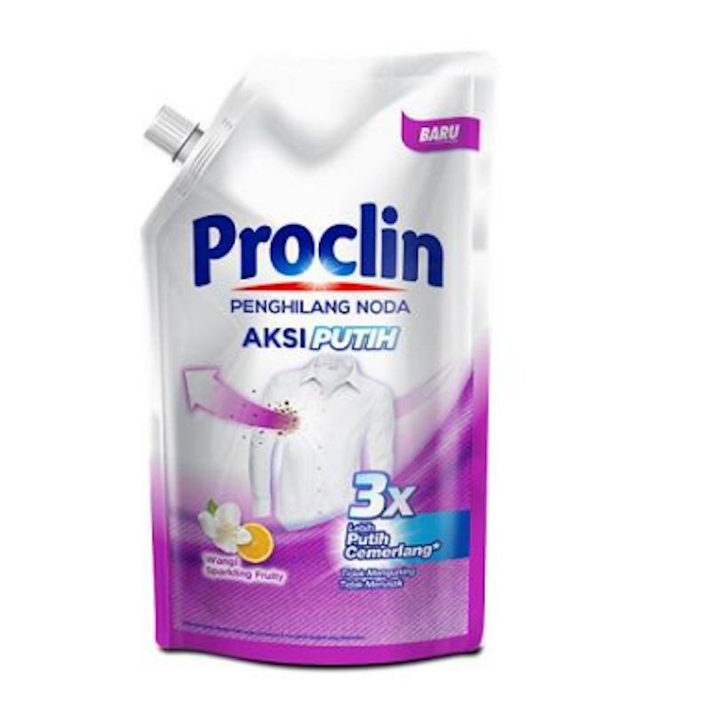 Proclin Aksi Putih mencerahkan pakaian putih kusam dengan aroma buah segar. Kemasan pouch ramah lingkungan dan aman dari tumpah.