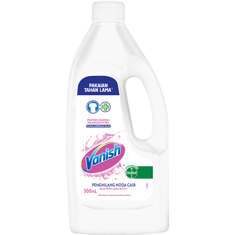 Vanish White Liquid memutihkan pakaian tanpa merusak kulit tangan. Mengandung hidrogen peroksida untuk noda cemerlang dan perlindungan Dettol dari kuman.