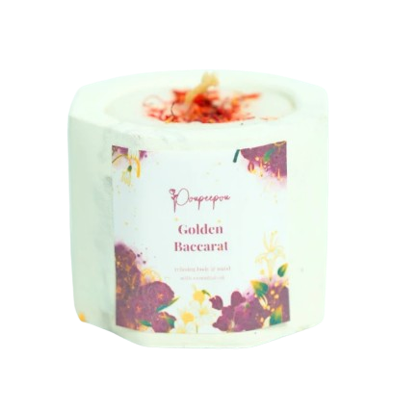 Lilin aromaterapi dengan desain marmer industrial dan aroma Baccarat Saffron mewah, menciptakan suasana eksklusif dan romantis.
