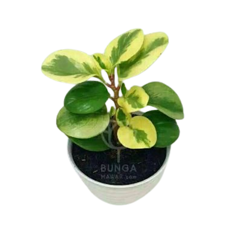 Paperomia Obtusifolia Variegata, tanaman hias dengan daun tebal dan berwarna hijau glossy dengan guratan putih atau kuning. Mudah dirawat, tahan kering, dan efektif menyerap racun udara.
