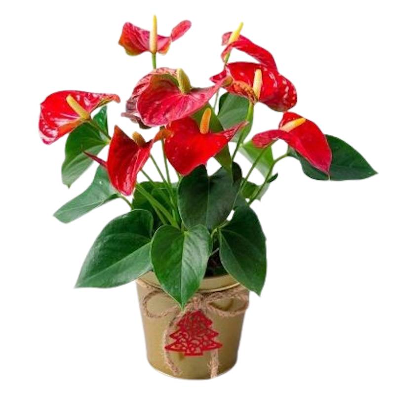 Anthurium Andraeanum, tanaman hias dengan bunga merah yang cantik, mempercantik ruangan, serta memberikan manfaat kesehatan seperti obat radang tenggorokan dan gangguan pencernaan.