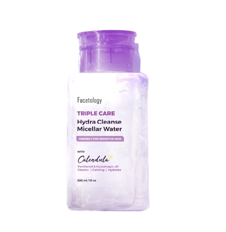Facetology Triple Care Hydra Cleanse Micellar Water membersihkan wajah secara efektif dengan panthenol, calendula, dan hyaluronic acid, menenangkan kulit dan menghidrasi, cocok untuk kulit sensitif, kering, dan berjerawat.